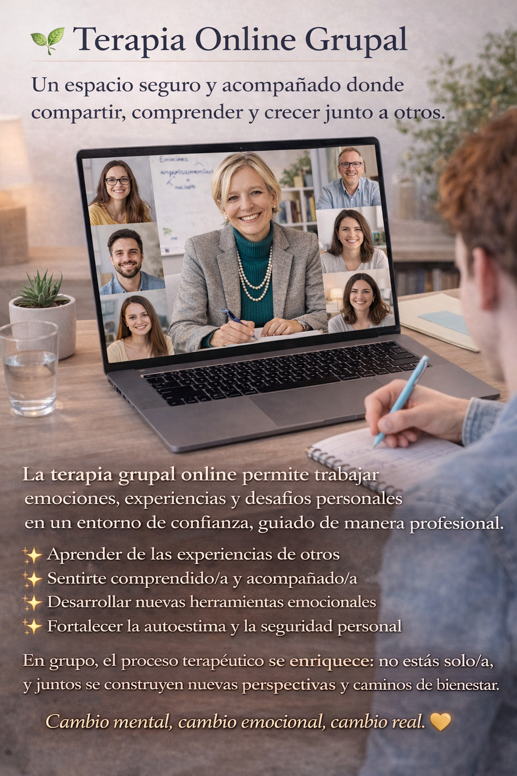 La terapia grupal online permite trabajar emociones, experiencias y desafíos personales en un entorno de confianza, guiado de manera profesional.