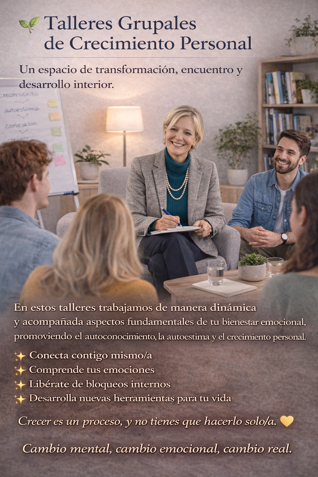 En estos talleres trabajamos de manera dinámica y acompañada aspectos fundamentales de tu bienestar emocional, promoviendo el autoconocimiento, la autoestima y el crecimiento personal.